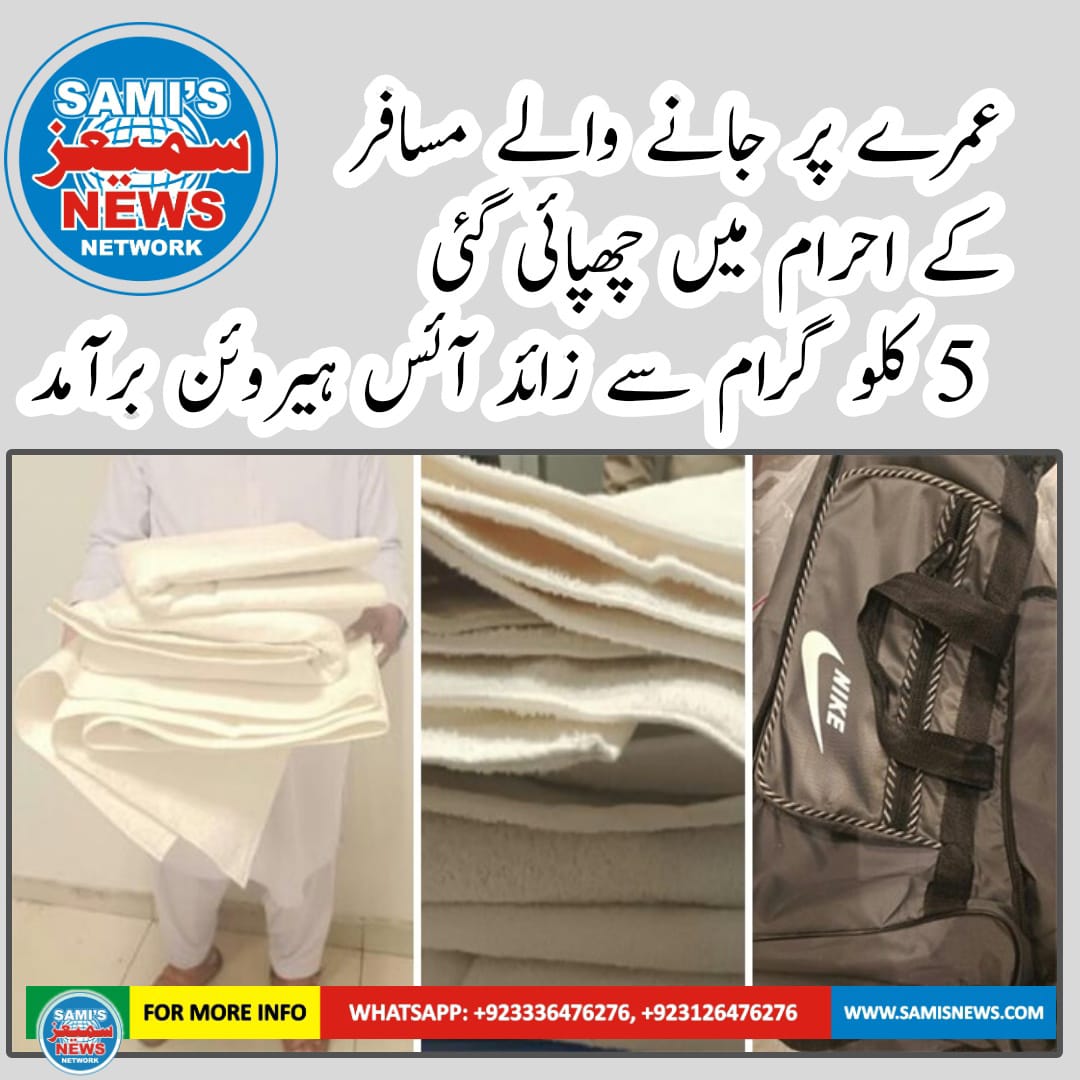 عمرے پر جانے والے مسافر کے احرام کے 3 تولیوں میں بھگو کر جذب کی گئی 5 کلو گرام سے زائد آئس ہیروئن برآمد کر لی۔ Posted on September 20, 2023September 22, 2023 by عمرے پر جانے والے مسافر کے احرام کے 3 تولیوں میں بھگو کر جذب کی گئی 5 کلو گرام سے زائد آئس ہیروئن برآمد کر لی۔
